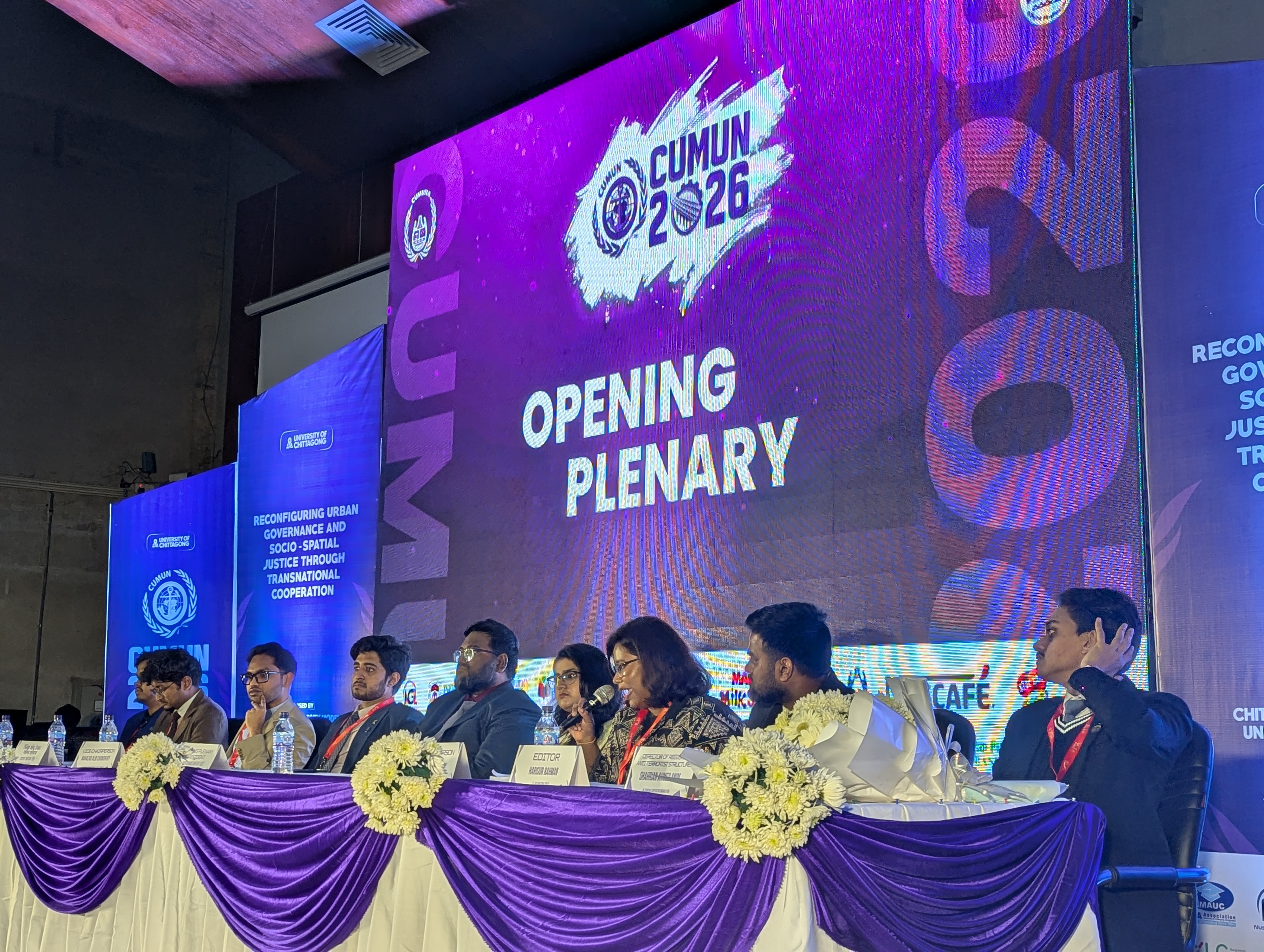 The Opening Plenary Session began at 4:30 PM, with General Secretary Anika Tahsin Sami inviting President Mohammad Shafkat Aziz to chair the session. Aziz introduced the Executive Body Members overseeing seven committees: DISEC, UN Women, UNHRC, International Press, SCO, Bangladesh Election Commission, and UN-Habitat.