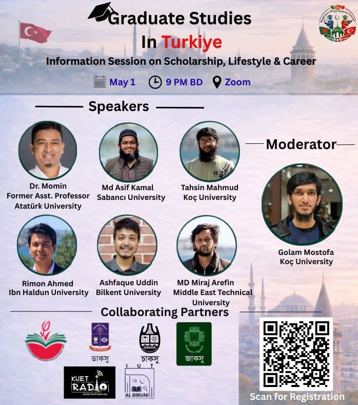 A free online information session on graduate studies in Türkiye — covering scholarships, student life and career prospects; will be held on May 1 at 9 PM (Bangladesh time) via Zoom. The session is organised by the Türkiye-Bangladesh Students Network.